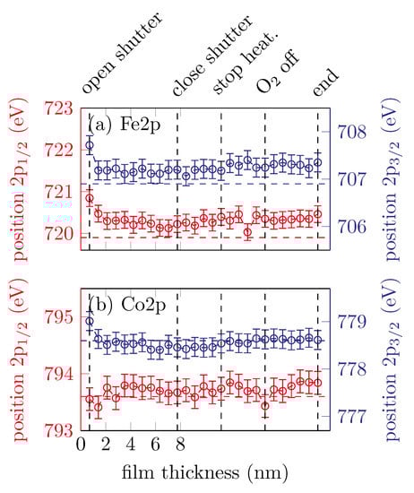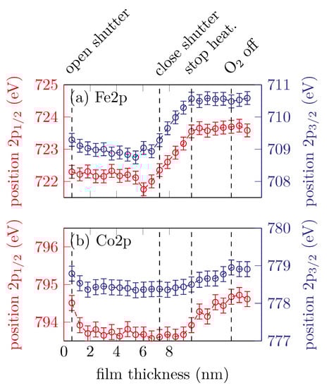 It is clearly visible that both of the Fe 2p peak position remain constant for approximately the first until the shutter is closed and then shift to higher binding energies with increasing scans, which corresponds to an increasing amount of Fe3+ valence states. After the heater is turned off, the peak positions remain constant at around for the Fe 2p3/2 and for the Fe 2p1/2 peak. The peak positions for both the Co 2p3/2 and Co 2p1/2 peaks remain constant within uncertainties until the heater is turned off, at around and , respectively. This indicates Co2+ valence states. After the heater is turned off, the peak positions shifting to higher binding energies until the oxygen valve is closed.