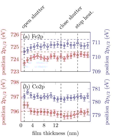 Figure 5 shows the peak positions of the Fe 2p3/2, Fe 2p1/2, Co 2p3/2 and Co 2p1/2 peaks changing with film thickness.