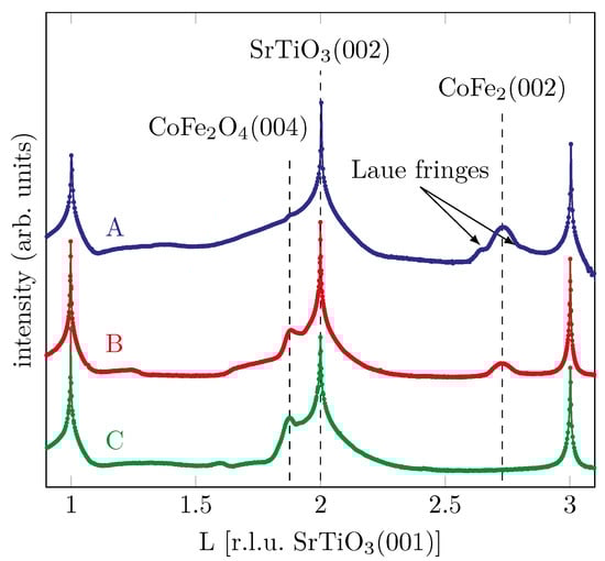 In order to control the structural properties of the samples, ex situ XRD measurements have been performed in geometry after growth of the films. All data were scaled to the reciprocal lattice units (r.l.u.) of SrTiO3(001). Figure 8 shows the recorded XRD scans for all prepared samples.