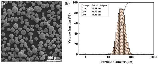 This study employed commercial spherical WC-17Co (WC: 83, Co: 17) powders supplied from the Shenyang Institute of Nonferrous Metals. The morphology of the powders was characterized by the Phenom Prox scanning electron microscope (SEM, Eindhoven, The Netherlands), and the particle size distribution of powders was measured by the laser particle size analyzer (Bettersize 3000 Plus, Dandong, China). As shown in Figure 1, the WC-17Co powders present a spherical shape with a D50 value of 34.72 μm. In addition, the flowability of the WC-17Co powders was determined using the static Angle of Repose (AOR), as shown in Table 1. The AOR of the WC-17Co powders, determined based on a flow tester powder comprehensive characteristic tester (Bettersize 100, Dandong, China), was 26.3°, proving good flowability for the powders.