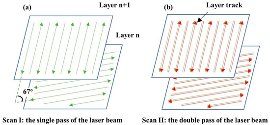 A single melting strategy (Figure 2a) and a remelting strategy (Figure 2b), with a rotation angle of 67° between layers, were used. The processing parameters of the specimens are shown in Table 2.