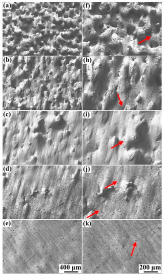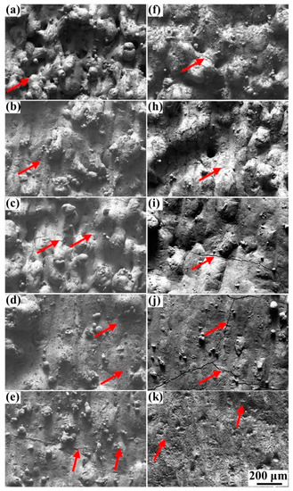 The high-magnification SEM pictures of the top surface morphology corresponding to Figure 3: (a–e) Scanning speed of 370 mm/s, laser power from 95 to 215 W; (f–k) scanning speed of 240 mm/s, laser power from 95 to 215 W.