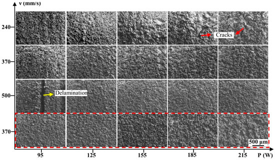 The front surface morphology of the specimens was also observed by SEM, as shown in Figure 6. It revealed that a large quantity of the powders adhered to all of the blocks’ surfaces. This phenomenon, similar to the previous studies [34], was inevitable because the liquid phase would sinter adjacent powders to form the molten pools. Although the existence of these powders led to difficulty in observing the actual surface morphology of these blocks, it was still found that apparent delamination appeared at the surface when the samples formed at 95 W, 500 mm/s, and severe cracks on the surface when the samples formed at 185–215 W, 240 mm/s. In contrast, other blocks had an intact surface without apparent defects.