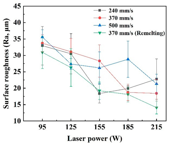The surface roughness of the blocks formed under different process parameters is shown in Figure 7, where the standard deviation is plotted as error bars. It directly proved that the remelting strategy provided a great improvement in the surface quality of the cemented carbide parts. When under the Scan I strategy, the surface roughness of the blocks presented a decreasing tendency with the increase in laser power or the decrease in scanning speed. With the scanning speed decreasing from 500 to 370 mm/s and laser power increasing from 95 to 215 W, the surface roughness decreased from 35.57 to 18.43 μm. When the scanning speed decreased to 240 mm/s, the best surface roughness was still obtained at the high laser power of 185 and 215 W, but the Ra value was not efficiently decreased compared to that of the blocks formed at 370 mm/s. Meanwhile, the surface roughness of the blocks was significantly decreased when the Scan II strategy was applied at 370 mm/s. Moreover, the best surface roughness of 14.10 μm was obtained. In addition, it could also be found that the small error bars were obtained when the surface roughness was good due to low fluctuation of the average roughness value, also proving the excellent surface quality.
