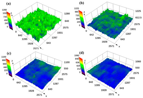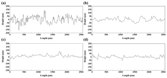 is the measured length and is the surface height from the average height of the surface (0 μm in Figure 9) [35]. Therefore, the strong fluctuant surface profile with a large height led to the high surface roughness, while the smooth surface profile with a small height (Figure 9c,d) corresponds to the low surface roughness. As shown in Figure 3, defects such as humps and holes that formed on the blocks directly caused this coarse surface morphology, which was not conducive to achieving low surface roughness.
