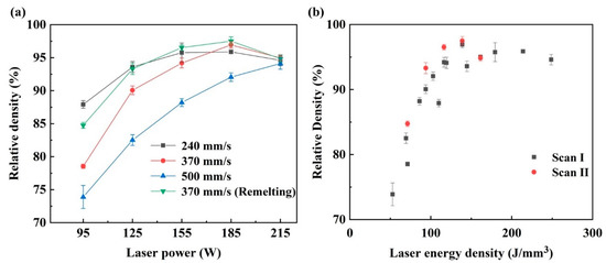 The relative density of the samples formed under different laser processing parameters and laser energy densities are shown in Figure 10. From Figure 10a, it was found that the relative density of the sample was closely related to the process parameters. At the scanning speed of 500 mm/s, the relative density increased from 74.89% to 94.11%, with the laser power increasing from 95 W to 215 W. When the scanning speed decreased to 370 mm/s, the relative density showed an obvious increment. The relative density still presented an increasing trend when the laser power increased from 95 W to 185 W, corresponding to the relative density increase from 78.55% to 96.44%. However, it decreased to 93.64% at the laser power of 215 W. Instead, the relative density did not increase when the scanning speed decreased to 240 mm/s, particularly at the high laser powers of 185 W and 215 W, whereby the relative density was 95.87% and 94.61%, lower than that at the scanning speed of 370 mm/s. The variation of the laser energy density caused this phenomenon. As shown in Figure 10b, a poor relative density was achieved at the low energy density, and increasing the laser energy density improved the relative density. However, the overly high laser energy density worsened the densification behavior. For comparison, it was found that the remelting strategy applied at the scanning speed of 370 mm/s could present better densification behavior for the specimens. Under the Scan II strategy, the relative density showed a similar increasing tendency from 95 to 185 W to the Scan I strategy, and the values were higher than that of Scan I, and the best relative density of 97.50% was achieved at 185 W. Besides, there is also a decrease in the laser power of 215 W, similar to the samples formed under the Scan I strategy.
