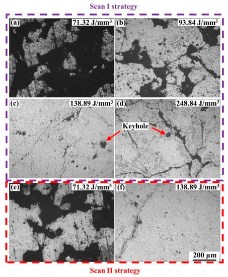 where is the dynamic viscosity of the liquid phase in the molten pool, is the atomic mass, is the Boltzmann constant, is the molten pool temperature, and is the surface tension, which is inversely proportional to [37], the low temperature of the molten pools caused by the low laser energy density would induce high viscosity of the liquid materials. Therefore, the wettability and spreadability of the liquid phase worsened. The metal liquid would not well spread and wet the metal powders, which limited the formation of regular and continuous scanning tracks, as shown in Figure 3, and the scanning tracks were irregular and discontinuous. Once these irregular scanning tracks form, the overlap between the adjacent scanning tracks would be loose and irregular. The irregular pores would form under these conditions. With the laser energy density increase, the molten pools would have more liquid materials with good wettability, forming regular and continuous laser tracks. The overlap between the adjacent scanning tracks was tight and regular. The formation of pores would be restrained. However, the thermal stress would be increased when the laser energy density increased, which aggravated the crack defects [23]. When the blocks were formed under the Scan II strategy, the remelting of the molten pools lengthened the solidification time of liquid materials [16]. The liquid phase had more time to spread and wet more materials, which contributed to regular scanning tracks with a large width, thereby achieving the tight overlap between adjacent laser tracks. The formation of pores would be efficiently restrained. Moreover, compared with the increment in the laser energy density by decreasing the scanning speed to 240 mm/s under the Scan I strategy, the remelting strategy had lower energy density input, which would decrease the thermal stress in the L-PBF processing and restrain the formation of serious cracks.