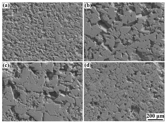 Figure 11 shows the polished surface of the blocks, and it exhibited that the pores and cracks on blocks induced the low relative density. When the laser energy density was low, large amounts of irregular pores formed on the blocks, leading to a low density. With the increase in the laser energy density, the number and size of irregular pores decreased, improving the relative density. However, some almost circular pores with a size of approximately 30–50 μm appeared, as shown in Figure 11c,d, when the laser energy density was high. These circular pores were keyholes, which were caused by the collapse of the vapor cavity that formed by the evaporation of the materials under a high laser energy density [36]. In addition, the cracks became more evident, and as shown in Figure 11d, the cracks were long and wide. Both the keyholes and serious cracks could also induce the low density of the blocks. Besides, the remelting strategy was able to effectively restrain the formation of pores at a low energy density, and the cracks merely became slightly worse compared to that under the single melting strategy. Therefore, a better relative density was achieved.