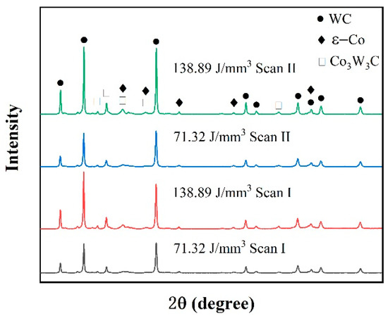 The microstructures of the blocks formed under different laser energy densities are shown in Figure 12, and it shows that the polygon-structured WC grains are distributed on the Co binder matrix, and characteristics such as the grain size and homogeneity of WC grains are highly dependent on the laser energy density. At the low energy density of 116.37 J/mm3, many of the tiny WC grains clustered on the Co binder matrix presented an inhomogeneous distribution. This result was caused by the low temperature of the liquid phase. According to Pasquet et al. [38], low laser energy density might produce a low temperature of molten pools that only exceeds the melting point of Co binder materials (1457 °C) but is lower than the melting point of WC (2870 °C), which was not conducive to grain nucleation. Thus, the microstructure presented inferior characteristics. When the laser energy density increased to 161.41 J/mm3, sufficient energy density could produce a sufficiently high temperature for the sintering and melting of all the materials. Therefore, it was found that the WC grains with large sizes were distributed uniformly on the binder matrix. Due to the overly high temperature of the liquid phase, the grain size continued to increase at the energy density of 248.84 J/mm3, and an apparent coarsening characteristic of WC grains was observed, which, in turn, was considered harmful for the performance of the cemented carbide parts [25]. Besides, it was found that both the grain size and distribution of WC grains could be improved by applying the remelting strategy by comparing the results of Figure 10a,d. The remelting strategy allowed for a long duration for the transformation from the liquid phase to the solid phase, which was beneficial to grain nucleation. The XRD result of the phase composition of the blocks, shown in Figure 13, also proved these phenomena. The results showed that, in addition to the WC phase and the hexagonal ε-Co phase, there was a Co3W3C phase in the specimens, which was similar to the results of Khmyrov et al. [30]. Furthermore, the Co3W3C phase would promote cracking. Moreover, it was found that the peak intensity of all phases increased when a high laser energy density was applied or the remelting strategy was adopted, leading to good grain nucleation, which was caused by the high temperature and long solidification time.