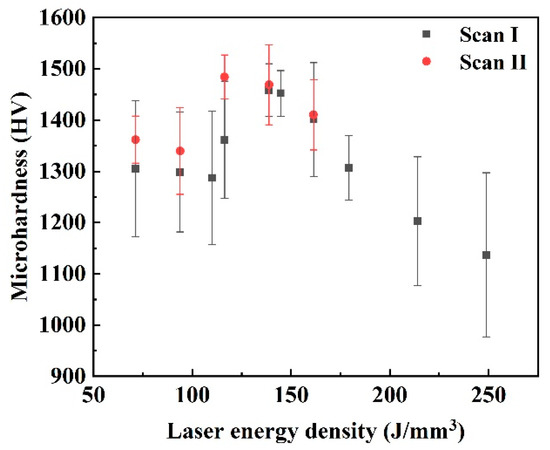 Figure 14 shows the microhardness of the blocks formed under different laser energy densities and scanning strategies. Under both the Scan I strategy and Scan II strategy, the microhardness presented a variable tendency that increased first and then decreased. Under the Scan I strategy, the lowest microhardness was around 1270–1300 HV when the laser energy density was below 109 J/mm3. The high microhardness was around 1401.2–1458.2 HV when the laser energy density was 138.89 to 161.41 J/mm3. When the laser energy density continued to increase, the microhardness decreased sharply. The lowest value of 1136.8 HV was obtained at the laser energy density of 248.84 J/mm3. Under the Scan II strategy, the high microhardness was around 1410.4–1484.4 HV at the laser energy density of 116.37–161.41 J/mm3. This phenomenon closely depended on the relative density and microstructure of the cemented carbide blocks. The high relative density with the WC grains uniformly distributed on the Co binder matrix contributed to a higher microhardness.