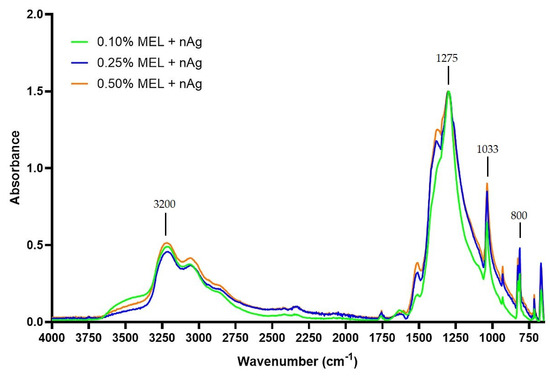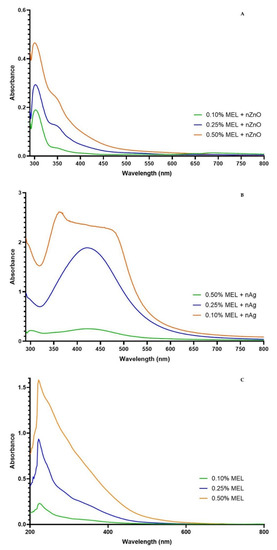 UV-Vis spectra of AgNP are shown in Figure 1B. The maximum absorption peak can be observed at 420, 421, and 361 nm for 0.10% MEL + nAg, 0.25% MEL 0.25% + nAg, and 0.50% MEL + nAg, respectively. These results are similar to data obtained by Shankar and Rhim [39], as well as Vilmala et al. [40].