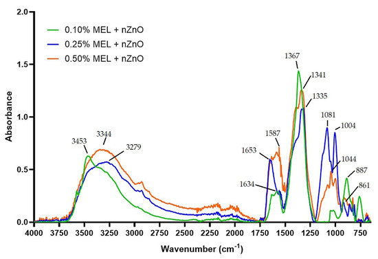 Figure 3 shows the FTIR spectra of ZnONP. Considerable differences in the intensity and position of the FTIR peaks can be noted for the individual samples. This is likely due to the different amounts of residual melanin due to the different concentrations used during preparation. The primary peaks occur in the spectral regions: 3500–3250 cm−1, 1600–1550 cm−1, 1400–1300 cm−1, 1100–950 cm−1, and 900–750 cm−1. These results are in good agreement with data obtained by Roy and Rhim [22], who also used melanin for ZnONP synthesis.