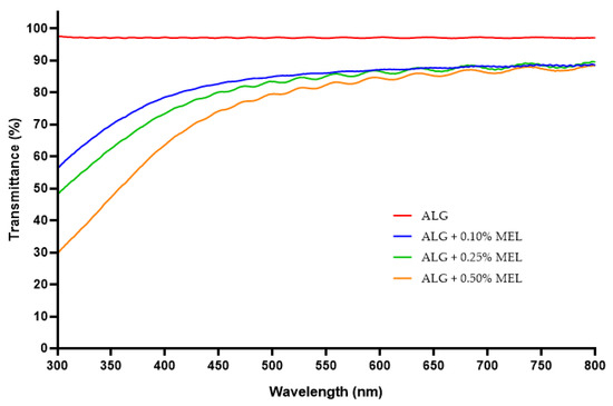 To evaluate the UV-Vis barrier properties, spectrophotometric spectra of the obtained films were analyzed. Figure 4 presents the UV-Vis spectra of the unmodified alginate film and the alginate films modified with increasing concentrations of melanin. The unmodified alginate film exhibited very poor (almost no) barrier properties against visible wavelengths, UVA, and part of the UVB range (above 300 nm). The addition of melanin caused a similar decrease in the transparency for visible light, regardless of melanin concentration. However, in the range of blue light, UVA, and UVB, the barrier properties increased with increasing amounts of melanin. Even the lowest melanin concentration (0.10%) had a significant effect on the transmittance of light at specific wavelengths. As mentioned earlier, melanins are known to have very good light absorption in the UV range. As a result, similar effects of melanins on light transmission have been reported for films of gelatin [54], agar [42], carrageenan [43], PLA [44], cellulose [55], carboxymethylcellulose [36], PBAT [49], and chitosan [45].