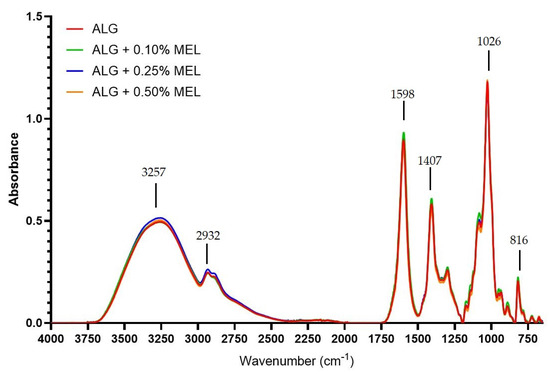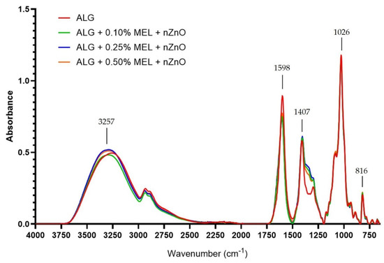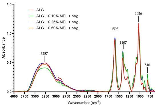 In order to investigate the presence of characteristic bonds in the samples FT-IR assay was performed. Figure 6 summarizes the FT-IR spectra of unmodified alginate film and melanin-modified alginate films without nanoparticles. The graph shows numerous bands in the wavenumber range between 600 cm−1 and 1750 cm−1 and bands in the range of 3700–3000 cm−1 corresponding to the stretching vibrations of the –OH bonds [59], and between 3000 and 2850 cm−1 caused by –CH stretching vibration [60]. The bands present in the range of 1750–600 cm−1 are characteristic of alginate and they are as follows: at 1598 cm−1 it is the result of asymmetric vibrations stretching the –CO bond in the –COO– group [59,60], at 1407 cm−1 caused by symmetrical stretching vibrations –CO in the –COO– group [61], at 1026 cm−1 associated with asymmetric vibrations –COC [60] and at 816 cm−1 being characteristic of the presence of mannuronic acid residues [61].