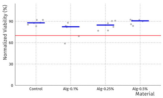 Cell viability data normalized to sham control (no disc) for alginate films with MEL and control film without MEL. Grey dots represent individual samples (n = 6), while blue bars indicate median values. Red line marks the 70% viability threshold of ISO10993-5.