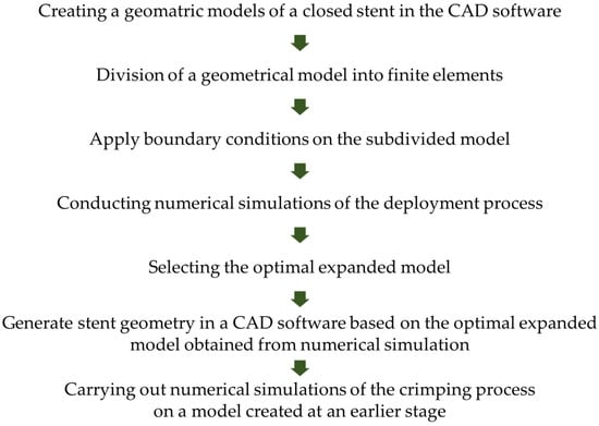 The typical design procedure is to create the stent-geometry model of the shape of the stent corresponding to its open form. However, one of the important stages of the angioplasty process is the stage of the stent insert in the affected artery. At this stage, the stent is crimped in closed form to deliver it to the appropriate position in the artery. We observe that in many cases the typical designing process leads to shapes which are difficult or impossible to crimp. The proposed designing procedure starts with the shape of the closed form. Based on the design experience obtained during work on the stent shape, where the shape of the stents is generally designed as their open forms, the new two-step modeling procedure is proposed to design the stent. The original part of this method is to reverse the typical design process for this kind of object.