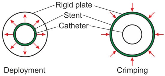 Figure 2 shows the numerical stages of the deployment process (on the left) and the crimping process (on the right). As we can see in the picture, in the case of the deployment process, the geometry—which is marked in green in the drawing—expanded, as shown in the red arrows. This process consists of multiplying the diameter of the catheter, and due to the contact between the catheter and the stent, the second one also increases its diameter (both internal and external). In the case of the crimping process, the geometry is closed by reducing the diameter of the rigid plate, and due to contact between the rigid plate and the stent, the diameter of the stent is reduced.