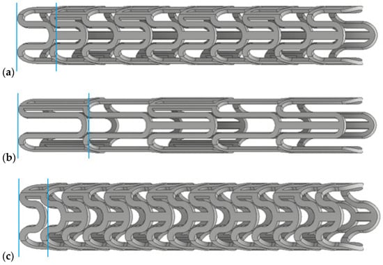 In order to demonstrate the proposed design process, three initial geometries of contracted stents were designed and subjected to a numerical deployment process; then, on the basis of the expanded form of stents, the optimal form is selected, or some geometrical changes are made. The initial geometry was chosen based on preliminary research in the field. Some information on stent design was provided by experimental studies on obtaining preset shapes produced by microinjection. The selection criteria were the ability to generate an appropriate closed- and open-form stent with the appropriate displacement and stress state. The variable in the geometric models was the length of the stent crown, which was manipulated to achieve satisfactory geometry and strength properties of the stent after deployment. Other values, such as: stent length and thickness, radius value of the rounded ring, and the thickness of the link, remained the same in all cases. In Figure 3 three proposed stent geometries are presented, which in the next step were subjected to a deployment process and in which the geometry of the expanded stent was observed on the basis of the input forms of the contracted stent.