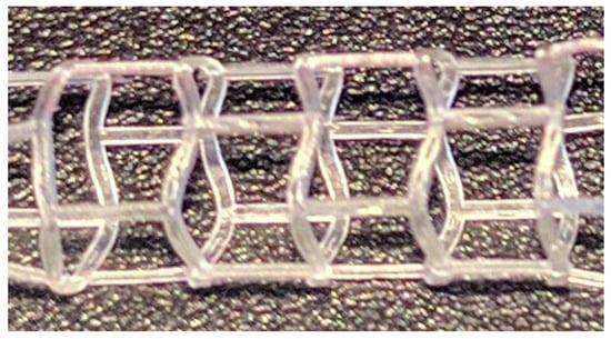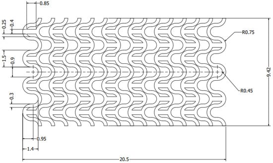 The sketch of half of the selected stent with marked characteristic values is presented in Figure 4. The thickness of the stent was 0.2 mm. This parameter was determined by experimental studies of stents obtained by microinjection using polymeric materials, as well as by simulation of the manufacturing process and the possibility of stent placement on catheter.