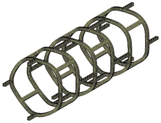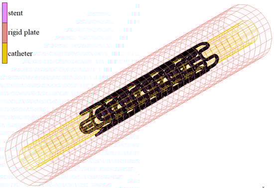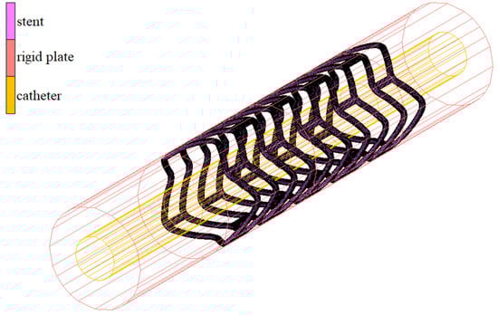 The numerical model of the deployment process is presented in Figure 6. The FEM mesh representing the stent has a contact-boundary condition with the inner surface, which is the catheter. This surface has a diameter equal to the outer diameter of the catheter. As mentioned at the beginning of the subsection, during numerical simulation, it gradually changes to destination diameter, which depends on the open form of the stent geometry, expanding the contracted stent on occasion. The stent also has a contact-boundary condition with an external surface modeled as a rigid surface with a diameter close to the inner diameter of the vessel. As a result of properly defined boundary conditions, the extended stent is adapted to two cylinders. Their diameters of both open rigid plates differ by the two wall thicknesses of the stent, so that the stent is adequately expanded but also not deformed as a result of too much pressure on the surface.