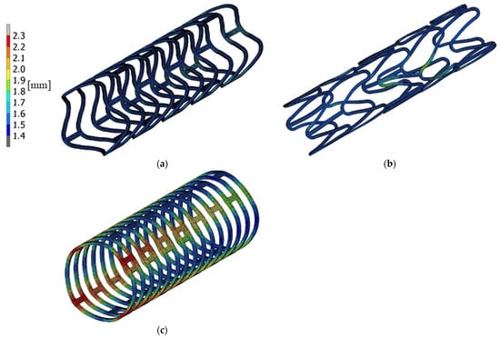 The initial geometry models were subjected to a numerical simulation of the expansion process to their final position in the arterial space. The FEM as a well-known and proven method in the modeling of mechanical systems was used during computations [37]. As numerical simulation software, the MSC Marc Computer-Aided Engineering (CAE) system was used. The models were discretized with eight-noded hexahedral finite solid elements with quadratic-shape functions. The average mesh size for each model was 0.05 mm. The division of three geometrical models into finite elements is shown in Figure 5. It was assumed that the material is linear-elastic, and the material properties correspond to typical PLLA (Young modulus 40 MPa and Poisson ratio 0.33) [38,39].