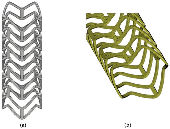The modified stent model after deployment simulation selected for the crimping process: (a) geometry, (b) discretized using finite elements.