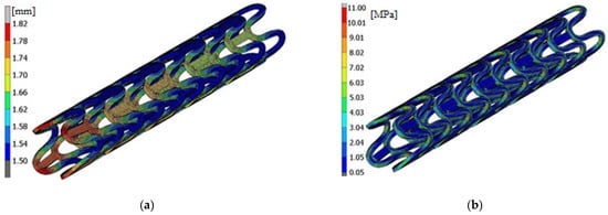 The largest deformation of a stent occurs at its ends and is 1.82 mm (Figure 11). The highest stress values are found in the place where the radius of the rounding of the stent crown is changing and is equal to 11 MPa. This value is more than three times lower than the Young module value for PLLA, which means that it will not yield to plasticization of the stent.