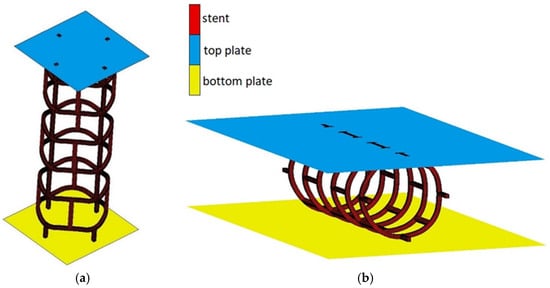 On the model prepared in this way, numerical simulations of stent compression were carried out. It was longitudinal compression and transverse compression (pinch). For both simulations, rigid plates were used to compress the stent in both radial and longitudinal directions. The numerical model has a defined contact between a rigid plate, which acts on the stent to induce compression in the corresponding axis, and an external surface, which acts as a base. The appropriate boundary conditions were also defined. In the simulations, the material model is based on mechanical properties which corresponds to the characteristic properties of PLLA. Figure 13 shows the stent with the plates acting as compression tools.