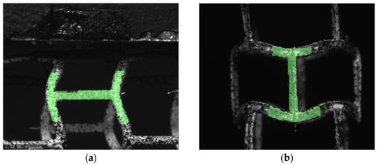 The Istra4D program allows us to apply a mask to the area of interest and then generate deformation maps on it, among other things. In this way, experimental results were obtained for both longitudinal and transverse compression. Figure 17 presents images from the Istra4D program showing the compressed stent models with a mask applied to the sections whose deformation results at the assumed force obtained by the experimental method we will compare with the results of the numerical simulation at the same boundary conditions.