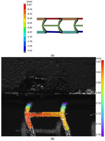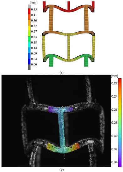 We obtained the results of the analysis of the stent fragment selected as representative of the stent model by both numerical simulations and experimental studies. Figure 18 shows a comparison of the results for transverse stent compression (pinch) for the numerical simulation as well as the experimental study developed using DIC Istra4D. The unit of displacements is mm.