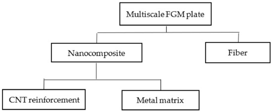 The performance of these FGM plates might be improved by using a multiscale hierarchical FGM as shown in Figure 2, which is made possible by combining the continuous fiber phase, the metal matrix, and CNT reinforcement. In such circumstances, the overall homogenization process can be divided into two phases: in the first phase, the dispersion of CNT in the metallic matrix yields a nanocomposite, and in the second phase, this nanocomposite receives ceramic inclusions in a graded manner, resulting in a CNT-reinforced multiscale composite. Since the CNTs are expected to be evenly distributed and randomly oriented throughout the matrix, the final mixture is considered an isotropic mixture. It is also expected that the bonding between CNT and matrix and dispersion of CNT in the matrix are perfect. Each CNT is assumed to be straight and has the same aspect ratio and mechanical properties. The matrix material is considered void-free, and the bonding between the matrix and fiber is excellent.