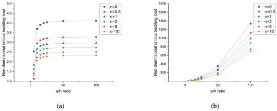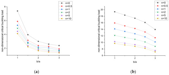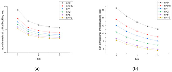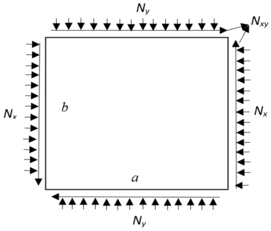 The rectangular plates shown in Figure 4 are subjected to in-plane loading in two different directions. In the given Figure 4 , , and are the in-plane axial loading and shear loading, where , , and .