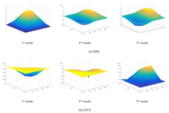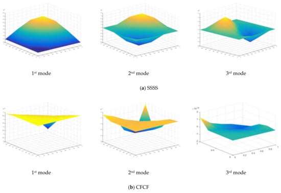 To validate the present MTSDT theory, the non-dimensional critical buckling load was calculated for a different side-to-thickness ratio of simply supported square plates under uniaxial and biaxial compressive loadings. The numerical values in Table 3 represent the critical buckling load for the Al/Al2O3 plate with 0% weight fraction of CNT reinforcement. The presented numerical results were compared with a previous numerical study [37] and are in good agreement with the reference. The mode shape of a simply supported plate for the first three nodes is presented in Figure 5 and Figure 6 for n = 0 and n = 1, respectively.