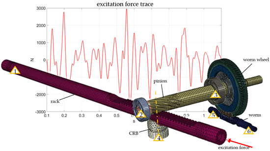 The simulations were run in two steps of implicit dynamic analysis in Abaqus software. The first step was the initial preload step, and the second step was the actual simulation with the excitation force (see Figure 4). The excitation trace was a real force value measured during the real test drives on the test track. The measured excitation force was applied both in numerical and experimental tests. The initial simulations were based on the general contact with hard contact penalty properties. The component movement was “locked” by fixed rotation of the worm at point no. 6 of the support.
