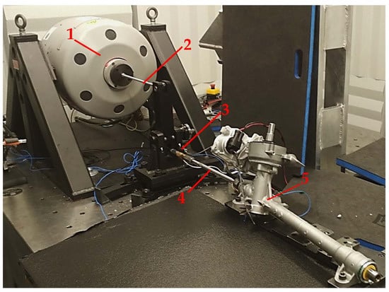 Test rig. 1—electrodynamic shaker, 2—stinger, 3—force sensor, 4—tie rod, 5—Tested EPS.