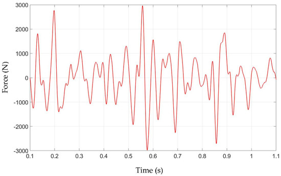 The excitation signal introduced to the assembly (Figure 6) was a 1-s-long force time signal recorded at the vehicle tie rod during a test drive at the track. Data acquisition, at the test rig, was started when the excitation signal and shaker output force (input to output) error were lower than 1% and the test environment was stable. The time for each measurement was at least 60 s, and the number of excitation instances was recorded in order to verify the repeatability of conducted measurements.
