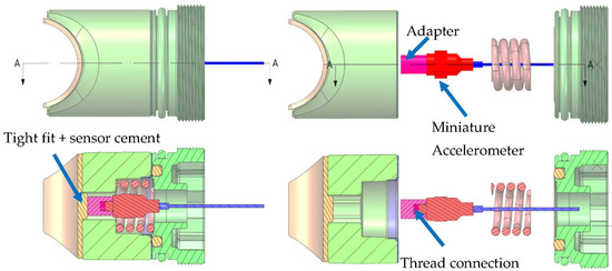 A single axis accelerometer measured the vibration of the CRB in the direction perpendicular to the rack. The accelerometer placed inside the CRB assembly was firmly attached to the main body of the CRB by means of a custom adapter cemented into the body (Figure 7). The assembled sensor ready for measurements is presented in Figure 8.
