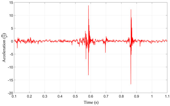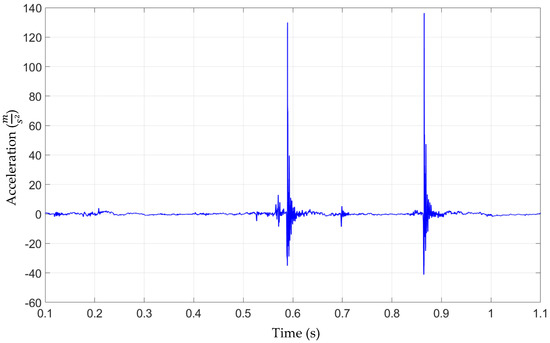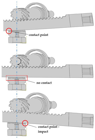 The accelerations were excessively high, but the behavior of the model based on the qualitative manner was correct. As expected and observed in the preliminary numerical and experimental simulations, the main excitation was in the contact pairs CRB–RACK and RACK–PINION. The character of the impact is presented in Figure 12.