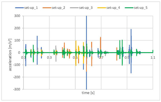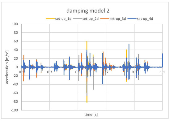 Finally, the models with contact damping (Figure 14), implemented to simulate the grease influence, gave the results that corresponded the closest to the standard EPS. The experimentally observed values were in the range of −15 m/s2 to 15 m/s2. The lowest values obtained in the numerical model (set-up_4d Figure 15) oscillated in a similar range. Only one pick exceeded that range and reached the value of −40 m/s2 to 40 m/s2. Due to that fact that the exact final value of the acceleration level may be the result of a specific combination of all mentioned, tested, as well as neglected in the simulation factors, the obtained results were accepted as successful at this stage of the research. The authors see the need for further, more detailed analysis; however, the main factors influencing the model sensitivity and its influence on the correlation with experimental results were defined.
