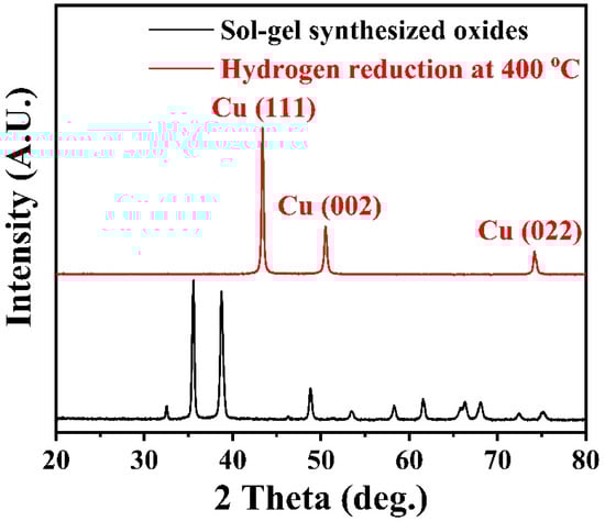 XRD patterns of sol-gel synthesized oxides and the powders hydrogen-reduction at 400 °C for 1 h.