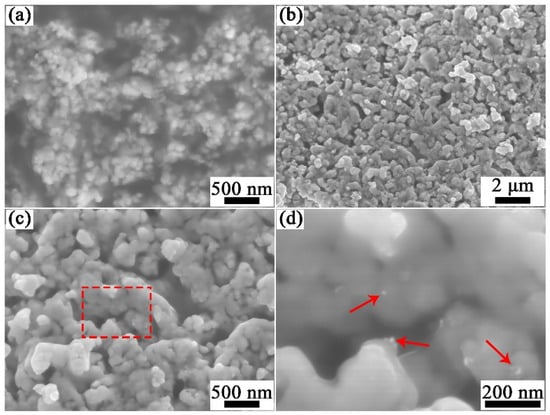 SEM images of (a) sol-gel synthesized precursor powders, (b,c) hydrogen reduced Cu-1wt.%Y2O3 powders at 400 °C for 1 h, and (d) magnification of the region marked with red dotted line in (c).