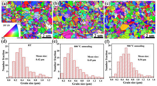 The mechanical properties of dispersion-strengthened materials is closely linked to the grain structure and the size and distribution of the strengthening phases. Figure 4a,d shows the inverse pole figure (IPF) maps of as-sintered Cu-1wt.%Y2O3 alloy and the corresponding grain size distribution. The majority of Cu grains in the as-sintered Cu-1wt.%Y2O3 alloys are in the submicron range with an average grain size of 0.42 μm. Compared with the Cu-5vol%Y2O3 alloy (average grain size 1.15 μm) prepared by mechanical alloying [24], the grain size of the Cu-1wt.%Y2O3 alloy is obviously refined. After annealing at 800 °C, the grain growth in the Cu-1wt.%Y2O3 alloy is not obvious with an average grain size of 0.45 μm, as shown in Figure 4b,e. As the annealing temperature increases to 900 °C, the average grain size of the Cu-1wt.%Y2O3 alloy increases to 0.54 μm, and the annealed sample consist of two different types of grains: larger recrystallized grains and smaller submicron grains, as shown in Figure 4c,f. This phenomenon is attributed to the recrystallization of copper during high-temperature annealing. The recrystallized grains nucleate from the grain boundary and then many small submicron grains grow into recrystallized grains. Meanwhile, the Y2O3 particles distributed in the Cu matrix can effectively inhibit the growth of the grain and many grains are still smaller than 0.5 μm in size even after 900 °C annealing. Overall, the recrystallization temperature of Cu-1wt.%Y2O3 alloy samples is significantly higher than that of the Cu samples, and Y2O3 particles plays a significant role in the improvement of grain refinement and thermal stability.