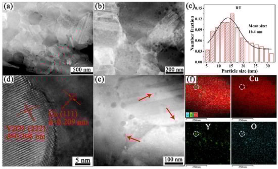 In addition to the effect of grain size, the size and distribution of Y2O3 particles in the Cu-1wt.%Y2O3 alloy play an important role in improving the strength of the material. Figure 5 shows the dark field TEM (DF-TEM) images, particles size distribution of Y2O3 and elemental distribution mapping of the Cu-1wt.%Y2O3 alloy. It can be seen from the DF-TEM image in Figure 5a that there are many twins, most of which have grain sizes below 500 nm, and some larger Y2O3 particles are distributed at the grain boundaries. The specific distribution and size of Y2O3 particles on Cu are shown in Figure 5b,c. Nanoscale Y2O3 particles with an average size of about 16.4 nm are uniformly distributed in the interior and grain boundary of copper grains. Many Y2O3 particles with a particle size smaller than 10 nm are evenly distributed in the grains. Dispersing nanosized particles in the grain interior is an effective method to improve the strength and ductility, because the intragranular particles can generate, pin down and thus accumulate dislocations within the grains [29]. Figure 5d shows the high resolution transmission electron microscope (HRTEM) image of the interface between Y2O3 particles and the copper matrix. The measured interplanar distance of the Y2O3 particle and Cu matrix is 0.306 nm and 0.209 nm, respectively, corresponding to the values of the Y2O3 (222) and Cu (111) planes from the Powder Diffraction File (PDF) card of 98-001-6394 and 98-006-4699. In addition, the local area of particle distribution is analyzed through elemental distribution mapping, as shown in Figure 5e,f. Through the elemental distribution mapping of Cu, Y and O and analysis results of HR-TEM, it can be determined that the particles uniformly distributed in Cu matrix are Y2O3 particles. In fact, the uniform distribution and small size are attributed to the Cu-1wt.%Y2O3 alloy powders prepared using the citric acid sol-gel method and the short sintering time by SPS, which effectively reduces the number and size of Y2O3 particles at the grain boundaries. These Y2O3 nanoparticles with a high melting point and high hardness greatly improve the strength and thermal stability of the alloy.