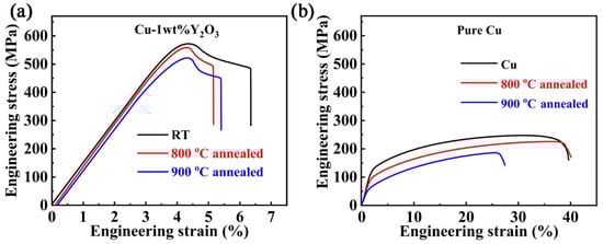 Tensile engineering stress-strain curves of (a) Cu-1wt.%Y2O3 and (b) pure Cu before and after annealing at different temperatures.