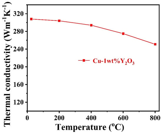 The thermal conductivity of copper alloys is one of the most important parameters that determines whether they can be used as heat sink material for future fusion reactors. However, there are few mentions in the literature about the thermal conductivity of Y2O3 dispersion strengthened copper alloy. Figure 9 shows the thermal conductivity of the Cu-1wt.%Y2O3 alloy was measured at different temperatures from RT to 800 °C. The thermal conductivity of the Cu-1wt.%Y2O3 alloy at room temperature is 308 Wm−1K−1, which is lower than that of pure copper. The decrease in thermal conductivity after Y2O3 addition can be ascribed to the relatively lower thermal conductivity of Y2O3, and more defects such as the grain boundaries and Cu/Y2O3 phase interfaces than in pure Cu. These defects would scatter electrons and therefore reduced the thermal conductivity [28]. The thermal conductivity of the alloy decreases with the increasing temperature. Even so, the thermal conductivity at 800 °C of the Cu-1wt.%Y2O3 alloy is above 250 Wm−1K−1, which is still superior to the value of the W-Cu composite [32].