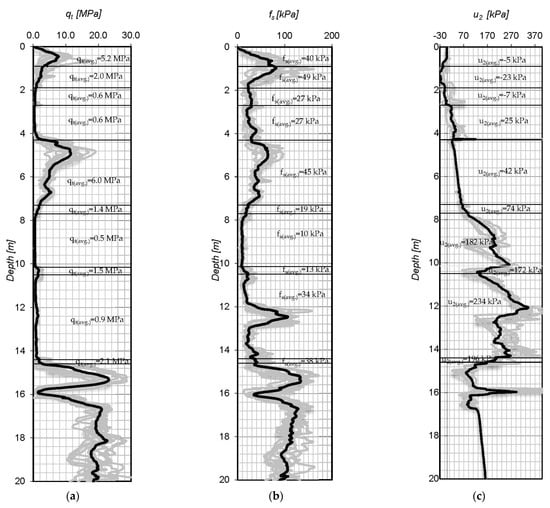 The CPTu measurement results of: (a) corrected cone resistance, (b) sleeve friction, (c) pore water pressure with average CPTu measurement value per soil layer.