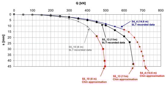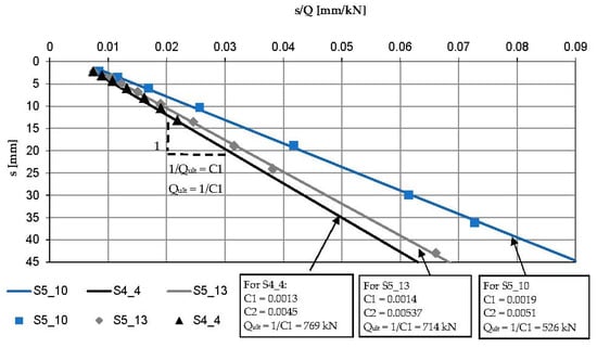 Within the S-7 project, 69 screw piles were constructed at the test site. There were compression piles, tension piles and anchoring piles used for static load tests. For the purpose of this research, three tension piles were selected: 8 m, 11 m and 14.6 m long (S5_10, S5_13, S4_4). They were chosen as representative ones as they were subjected to maximum head displacement during SLT. The first two piles were floating ones, the longest pile was just resting on the roof of the compacted sand layer. The reference piles were 0.4 m in diameter. They were situated very close to each other within the perimeter of 20 m. They were proof-tested in the tension static load test. The load was applied on the pile head in increments of 50 kN in 10 min intervals and the corresponding pile settlement was recorded. The maximum applied loads were 450 kN for S5_10, 650 kN for S5_13 and 600 kN for S4_4. The pile head displacements under the maximum applied loads were 19 mm (4.8%D), 43 mm (10.7%D) and 13 mm (3.2%D), respectively. The ultimate bearing capacities of the reference piles were estimated by Chin’s approximation as the inverse slope of the linear function f(s) = C1.s + C2 where s is the settlement of the pile caused by the load, Q, in static load test and C1, C2 are the Chin’s parameters used to approximate the load–settlement curve. The approximated load–settlement curves of the reference piles with the corresponding SLT results are presented in Figure 2. The ultimate bearing capacity in the tension of the reference piles according to Chin’s method is presented in Figure 3. The maximum applied pile loads varied from 78% of Qult for S4_4 to 91% of Qult for S5_13.