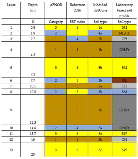 The Jazowa site soil profile according to the examined methodologies is presented in Figure 4. The three analyzed soil classifications–based on the Robertson SBT index, used in the AFNOR standard and the Modified Unicone method give a similar interpretation of subsoil layers. The sandy soils according to the AFNOR standard were defined as sand by the Robertson classification and medium dense sand and dense sand by the Modified Unicone method. The clayey soil layer locations were consistent for all examined methodologies. Regarding the intermediate soils, the AFNOR standard does not differentiate them in contrast to the Robertson classification and the Modified Unicone method. The intermediate soils of the Jazowa site are defined as sand mixtures and silt mixtures according to the Robertson approach and as sandy silt, medium dense silt, clayey silt and firm to medium soft silty clay according to the Modified Unicone method.