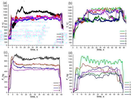 FSP temperature and resistance force dependencies on time for 1–4-pass FSP on Ti6Al4V (a,c) and 1–6-pass FSP on Ti6Al4V/Cu (b,d). Each of the FSP pass times was limited to that of the shortest last pass.