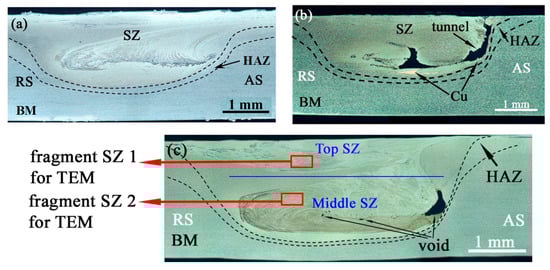 The stir zone macrostructures after 4-pass FSP on Ti6Al4V (a), single-pass FSP on Ti6Al4V/Cu (b), and 6-pass FSP on Ti6Al4V/Cu (c). SZ—stir zone; RS—retreating side; BM—base metal; HAZ—heat-affected zone; AS—advancing side.